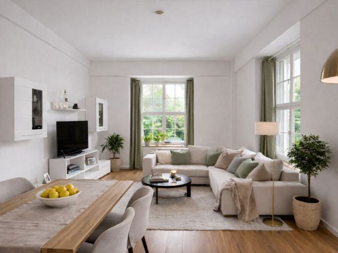 Die im Erdgeschoss gelegene Wohnung bietet ca. 82,15 m² Wohnfläche und drei gut geschnittene Zimmer. Große Fenster sorgen für viel Tageslicht und unterstreichen den klaren, geradlinigen Stil der Räume, der an modernes Loftwohnen erinnert. Der Laminatboden und die in allen Räumen vorhandene Fußbodenheizung schaffen eine angenehme, wohnliche Atmosphäre.