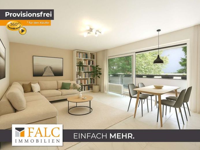 Das rund 25 m² große Wohnzimmer ist der Mittelpunkt der Wohnung. Eine breite Fensterfront öffnet den Blick ins Grüne und führt auf den ca. 16 m² großen, überdachten Balkon im Hochparterre – ideal für gemütliche Loungemöbel, Pflanzen und entspannte Stunden im Freien.