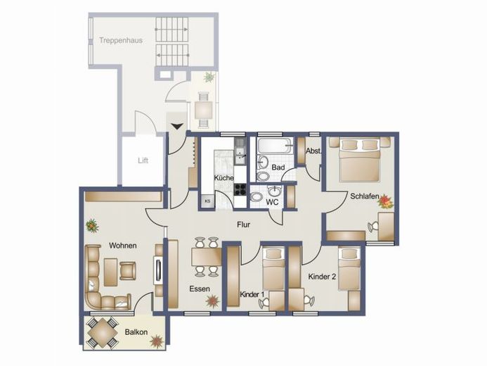 Der gelungene Grundriss der Wohnung schafft ein komfortables Wohnen. Das Wohnzimmer ist geräumig und bietet ausreichend Platz für ein gemeinsames Familienleben. Auf dem anschließenden, überdachten Balkon kann man sich diesen Wohlfühlbereich noch erweitern und gemütliche Plätzchen schaffen.