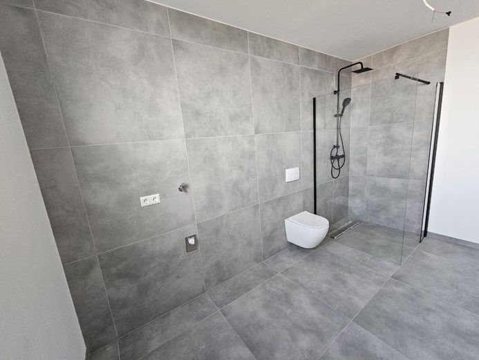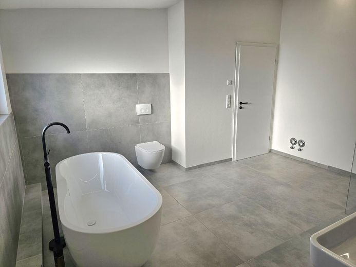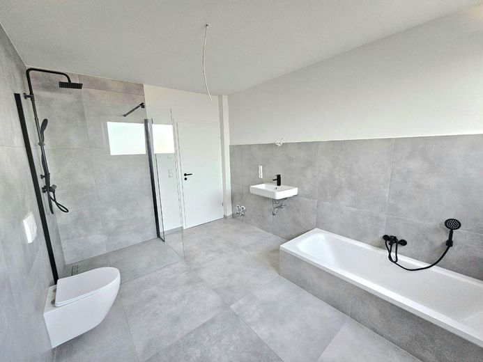 -Modernes Bad mit begehbarer Dusche, Badewanne und Waschbecken