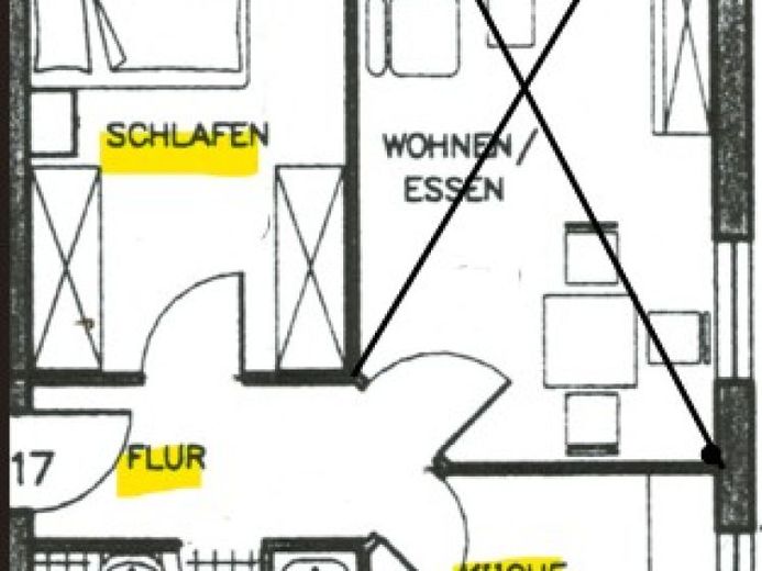 Hier wird 1 Zimmer als Wohngemeinschaft in einer 2-Zimmer-Wohnung angeboten. Die Wohnung ist vollständig eingerichtet. Sie befindet sich im Dachgeschoss (2. OG), ohne Lift.