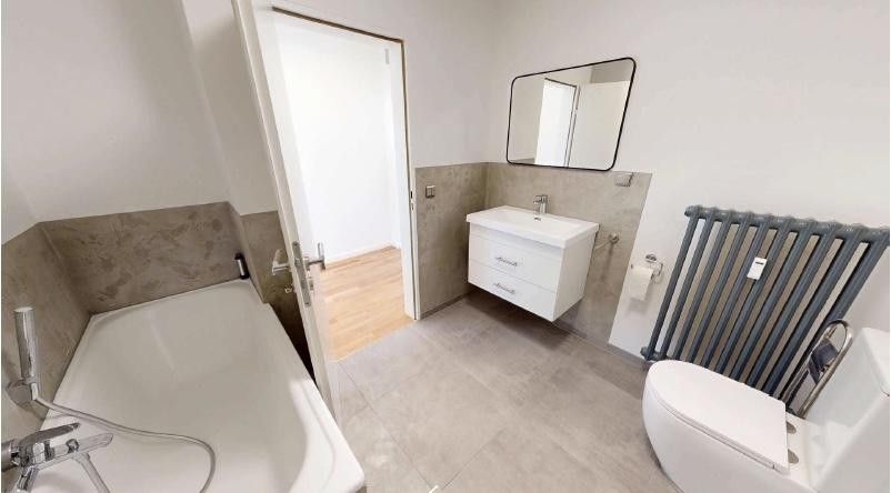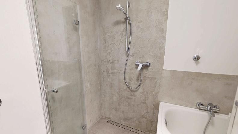 Das Bad wurde 2024 vollständig renoviert und verfügt über eine moderne Walk-In-Dusche mit Glastrennwand, stilvolle Fliesen und hochwertige Sanitärobjekte sowie einem Anschluss für Waschmaschinen.