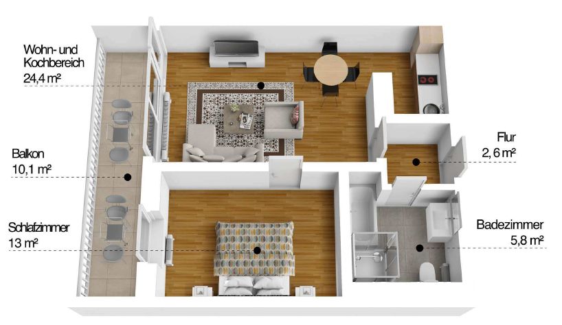 Auf rund 50 m² Wohnfläche erwartet Sie ein lichtdurchfluteter Wohn- und Kochbereich mit großer Fensterfront und Zugang zum großzügigen Balkon. Die offene Küche schafft ein modernes Wohngefühl und ist im Mietpreis enthalten.