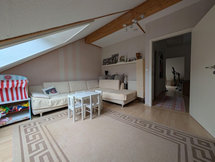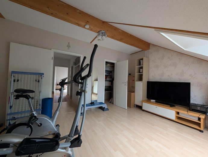 Im Dachgeschoss befinden sich zwei weitere Zimmer – eines wurde bislang als Fitnessraum genutzt. Zusätzlich gibt es ein weiteres Duschbad mit WC. Perfekt für Familien mit älteren Kindern, als Homeoffice- oder Hobbybereich.