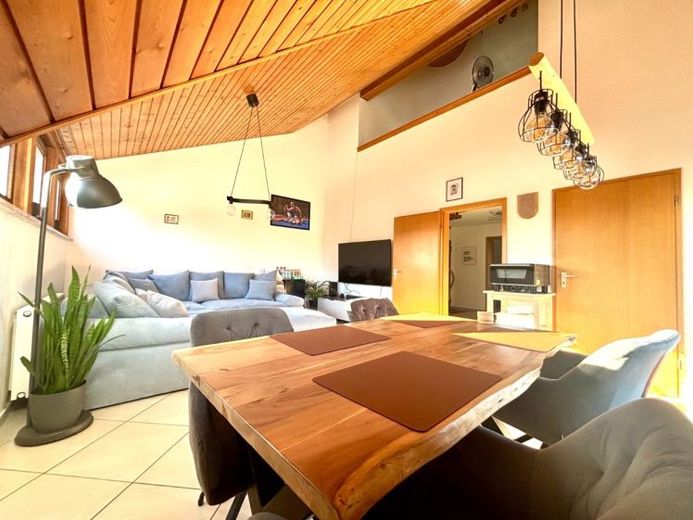 Beim Betreten der Wohnung empfängt Sie eine großzügige Eingangsdiele, die alle Räume der unteren Ebene miteinander verbindet. Von hier aus gelangen Sie in das gemütliche Schlafzimmer, das ruhig gelegen ist, sowie in das hell geflieste Badezimmer und die separate Küche. Herzstück der Wohnung ist der offen gestaltete Wohn- und Essbereich, der dank seiner bis in die Dachspitze ausgebauten Decke ein beeindruckendes Raumgefühl vermittelt. Von hier aus haben Sie Zugang zur überdachten Loggia mit Ostausrichtung – ideal, um den Tag bei Morgensonne mit einer Tasse Kaffee zu beginnen.