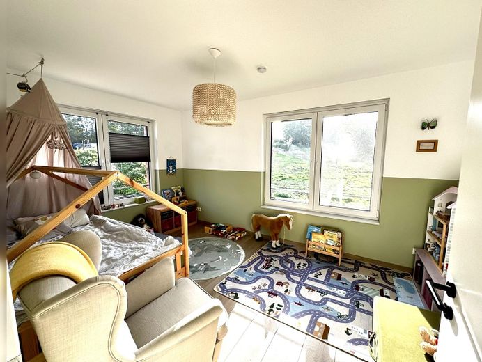 Das Haus wurde im KfW-Effizienzhaus-55-Standard errichtet und verfügt über eine Luftwärmepumpe, Fußbodenheizung, eine Photovoltaikanlage (13,92 kWp) mit 10 kW Batteriespeicher sowie einen Glasfaseranschluss. Zudem verfügt die große Garage (35 m2) über eine appgesteuerte und Smarthome-kompatible Wallbox für Elektromobilität – perfekt für energieeffizientes, modernes und nachhaltiges Wohnen.