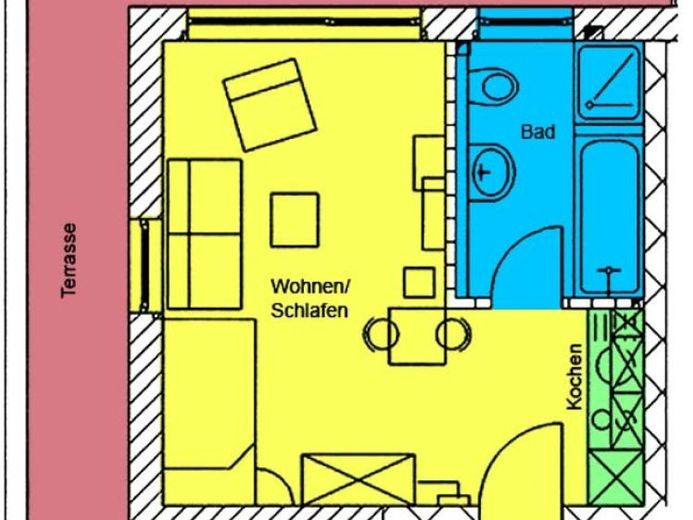 Das helle Wohn-/Schlafzimmer ist mit modernem Vinylboden ausgelegt. Die offene Küche ist im Wohn-/Schlafzimmer mit integriert. Die umlaufende Terrasse erreichen Sie vom Wohn-/Schlafzimmer. Das Tageslichtbad ist mit einer Wanne und einer Dusche ausgestattet. Die Wohnung verfügt über Außenjalousien. Der Waschmaschinenanschluss befindet sich in einem separaten Raum auf der Etage. Zur Wohnung gehört ein Keller.
