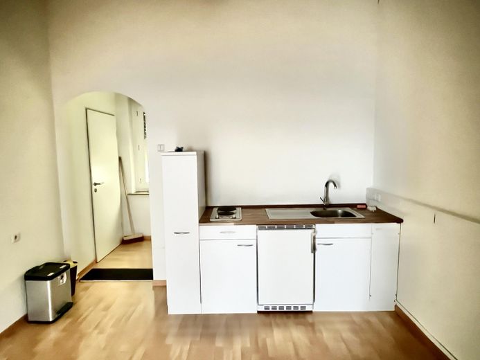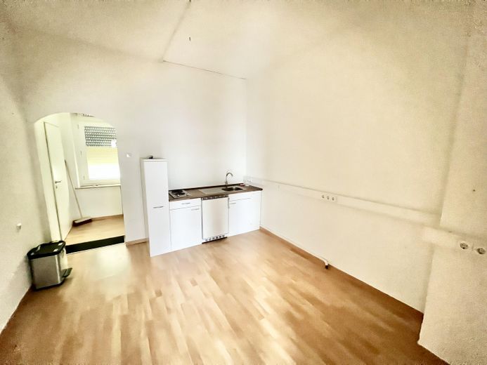 Zentral gelegene Seitenstraße von der Hauptstraße mit Läden und gegenüber eines Neubau-Wohngebiets.