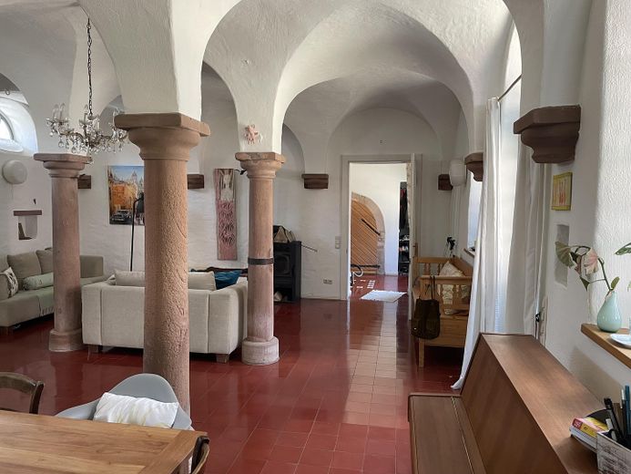 Vom abgeschlossenen Innenhof, der mit 2 weiteren Parteien geteilt wird, betreten Sie das Haus durch die großzügige Diele und blicken direkt in das 60 qm große, wunderschöne Kreuzgewölbe, das Herzstück des Hauses.
