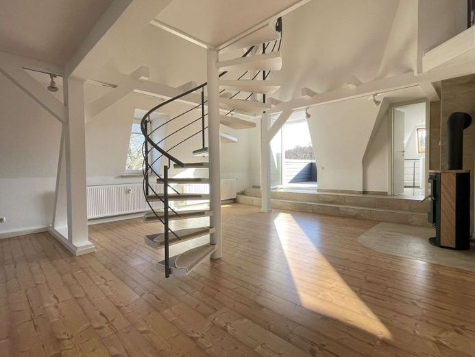 Die insgesamt drei Zimmer bieten vielfältige Nutzungsmöglichkeiten und ausreichend Platz für Paare oder kleine Familien. Im unteren Bereich der Wohnung finden sich das Kinderzimmer sowie das großzügige Wohnzimmer mit offener Galerie, das mit seiner Helligkeit und Großzügigkeit beeindruckt. Besonders hervorzuheben ist der neue Kamin, der an kalten Tagen nicht nur für wohlige Wärme, sondern auch für eine besonders gemütliche Atmosphäre sorgt.