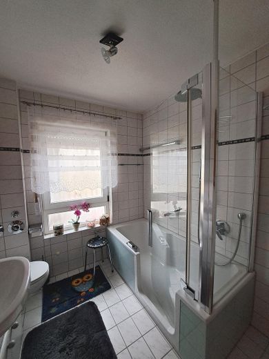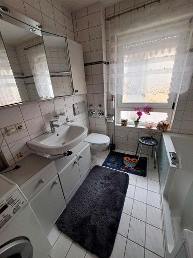 Das Tageslichtbad präsentiert sich modern mit einer TWINLINE 2 Dusch/Badewanne, hochwertigen Armaturen, modernen pflegeleichten Fliesen sowie einem Waschmaschinenanschluss.