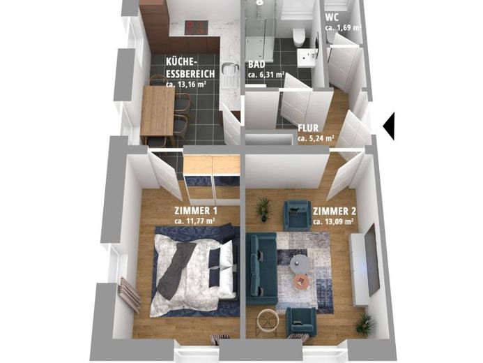 Zimmer (Wohnzimmer/Schlafzimmer), Flur, Küche, Badezimmer und zusätzlich auf
