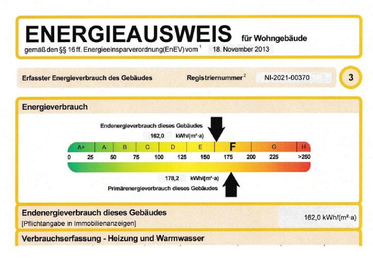 Endenergieverbrauch laut *Verbrauchsausweis : Klasse F / 162 kWh (qm-a)