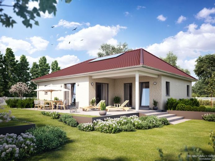 Grillparty und ein paar Regenwolken ziehen auf. Sie bleiben gelassen und rücken einfach etwas enger zusammen. Die überdachte Terrasse ist nicht nur optisch top, sondern auch einfach praktisch. Der Bungalow Cumulus 962 mit 125 m² verbindet Ihr sommerliches Frischluftbedürfnis mit dem Wunsch nach intelligent konzipiertem Wohnraum. Zugang zur Terrasse hat man nicht nur von dem Wohnbereich, sondern auch vom Schlafzimmer. Im Hausanschlussraum, der direkt an die Küche angrenzt, können einige Vorräte Platz finden. Die Abbildung zeigt eine Ausstattungsvariante.