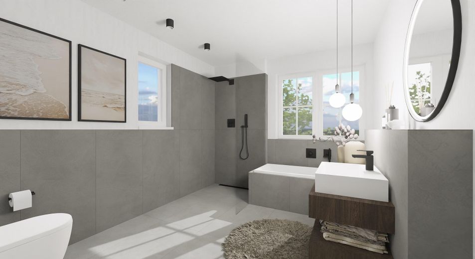 Die Grundrisse im Obergeschoss unterscheiden sich in der Lage des Balkons und der Anzahl der Badezimmer. Edle Echtholz-Parkettböden verleihen dem gesamten Haus eine warme und einladende Atmosphäre. Das Haus bietet zwei bis drei elegant gestaltete Badezimmer, die mit hochwertigen Sanitäreinrichtungen von Villeroy & Boch ausgestattet sind und verbinden Komfort und Eleganz.