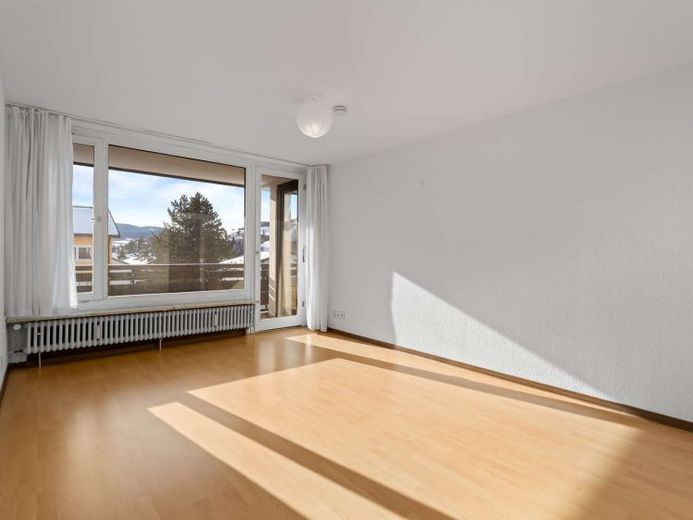 Die Küche ist mit einer modernen schwarzen Edelstahlküche und hochwertigen Geräten ausgestattet. Das helle Wohnzimmer bietet große Fensterfronten und Zugang zur Südloggia. Zwei Schlafzimmer, eines davon ebenfalls mit mit Zugang zur Südloggia, das andere mit Balkon und Blick ins Grüne, bieten flexible Nutzungsmöglichkeiten.