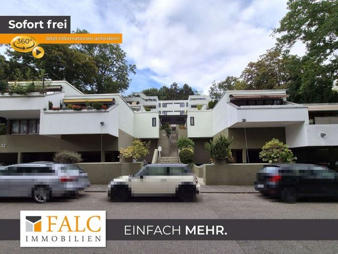 Der Wohnkomplex in der Nähe des Alten Kurparks ist terrassenförmig angelegt und verfügt über externe Treppenzugänge zu den einzelnen Wohneinheiten. Die zum Verkauf stehende Einheit befindet sich im obersten Geschoss.