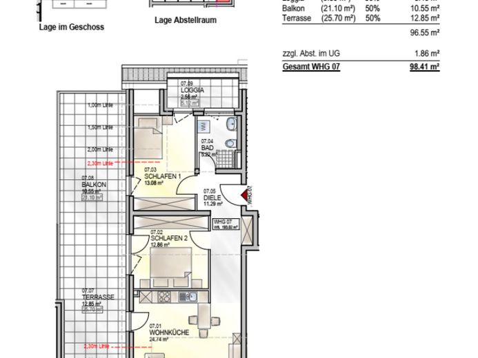Das Angebot bezieht sich auf die Wohnung 7 im Dachgeschoß. Sie gelangen über eine geräumige Diele mit Garderobe in die Wohnung. Mittelpunkt der Wohnung ist der helle Wohn/Essbereich von ca. 25 m² mit Ausgang auf die sonnige Loggia von ca. 10 m² mit herrlichem unverbaubaren Moselblick sowie auf den sehr großen Balkon von ca. 50 m². Von der zentralen Diele gelangen Sie in das geräumigen Bad mit Fenster von ca. 8 m² ausgestattet mit großen Dusche sowie dem Ausgang auf die Loggia 2 von ca 7 m². Ebenso gelangen Sie von der diele in das gut aufgeteilte Schlafzimmer 1 von ca. 14 m² sowie das hellen Kinderzimmer/Büro von ca. 14 m². Diese beiden Räume gelangen jeweils auf dem großen Balkon von ca. 50 m².
