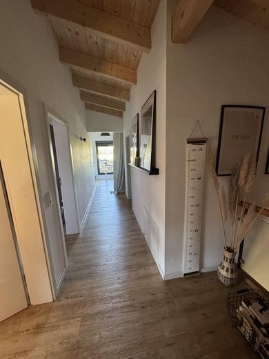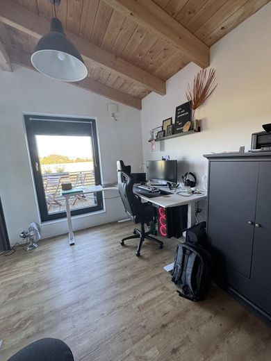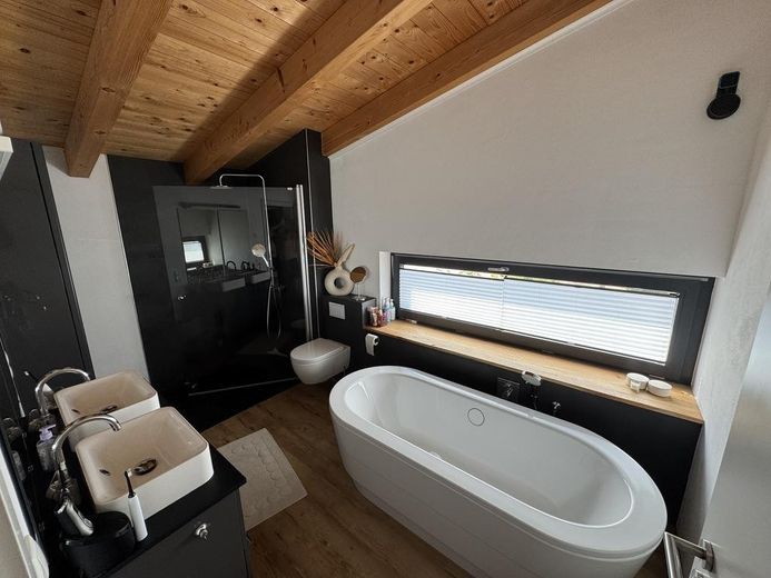 Im Obergeschoss stehen ein Schlafzimmer mit Ankleidezimmer, zwei Kinderzimmer, ein offenes Büro mit Balkonzugang sowie ein modernes Badezimmer mit Dusche und freistehender Badewanne zur Verfügung.