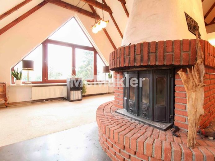 Ein besonderes Highlight ist das große Kaminzimmer im Obergeschoss. Mit seiner beeindruckenden Raumhöhe bis unter den Dachfirst entsteht hier ein offenes und gemütliches Wohngefühl. Dieser Raum bietet viel Potenzial und kann bei Bedarf geteilt werden, um weitere Zimmer zu schaffen oder beispielsweise ein Atelier oder ein Studio einzurichten. Ein kleines Duschbad grenzt ebenfalls an.
