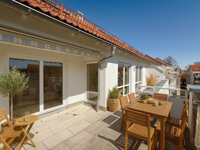Das exklusive Penthouse erstreckt sich über eine Wohnfläche von 117 Quadratmetern über zwei Etagen. Das Baujahr des Anwesens geht auf das Jahr 1995 zurück und zeichnet sich durch eine sehr gute Energieeffizienzklasse B aus. Die Wohnung beeindruckt mit insgesamt vier Zimmern, darunter drei Schlafzimmer und zwei Tageslicht-Badezimmer. Die 4 Zimmer sind großzügig geschnitten und lassen viel Raum für eigene Gestaltung. Der Wohnbereich und das Esszimmer ist mit bodentiefen Fenstern und einem Zugang zur Dachterrasse ausgestattet. Der Balkon mit angrenzender Dachterrasse ist ideal für gemütliche Abende mit Familie und Freunden. Der Ausblick und die Südausrichtung des Wohnbereichs schenken den Bewohnern angenehme Sonnenstunden. Zur Ausstattung gehört eine Küche mit EBK, ein Gäste-WC sowie ein Einbauschrank im Obergeschoss mit einem Abstellraum in der Dachschräge. Die Dachfenster verfügen über Sonnen- und Wärmeschutzrollos. Die Bäder sind einmal mit einer Dusche und einmal mit einer Badewanne ausgestattet. Es bleiben kaum Wünsche offen. Die Böden sind mit Teppich belegt, diese wurden bis Dato nicht getauscht um den neuen Eigentümern die Möglichkeit zu lassen, die Böden nach Ihrem Geschmack zu gestalten.