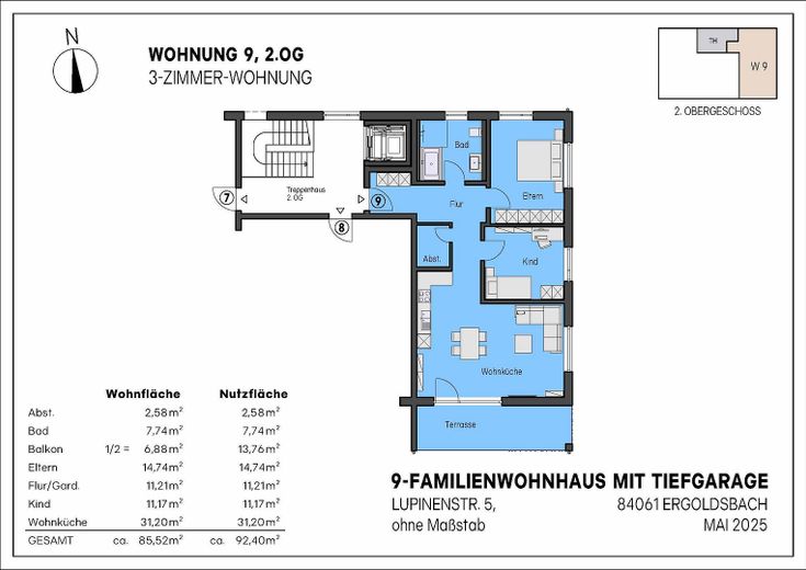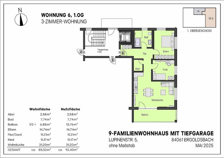 Die Wohnanlage enthält 9 Eigentumswohnungen. Es sind nur noch 2 Wohnungen verfügbar. Beides sind Dreizimmer-Wohnungen im 1. und 2. OG. Die Wohnfläche beträgt bei beiden Wohnungen 85,52 m².