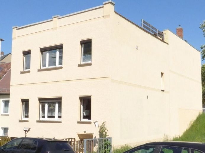 Das ungewöhnlich strukturierte Gebäude bietet viel Wohn- und Nutzfläche und ist von zwei Straßen aus zugänglich. Das unterschiedliche Niveau derselben bildet sich auch im Inneren durch unterschiedliche Ebenen, kleine Treppen usw. ab. Der Zugang zum Haus erfolgt über den Keller. Vielleicht kann hier bereits eine Verbesserung durch einen direkten Zugang zur Erdgeschossebene geschaffen werden. Im Keller stehen mehrere Räume zur Verfügung, u. a. auch für die Heizung im Duschraum. Das Erdgeschoss ist von zwei Durchgangszimmern geprägt. Vorhanden sind zudem Küche, WC, ein älteres Bad, Wohn- und Schlafzimmer. Im Obergeschoss stehen Flure, Küche und weitere fünf beheizte Zimmer mit unterschiedlichen Größen, geeignet zum Wohnen oder Abstellen, zur Verfügung. Es existiert noch ein Dachboden und der Zugang zum Flachdachbereich.