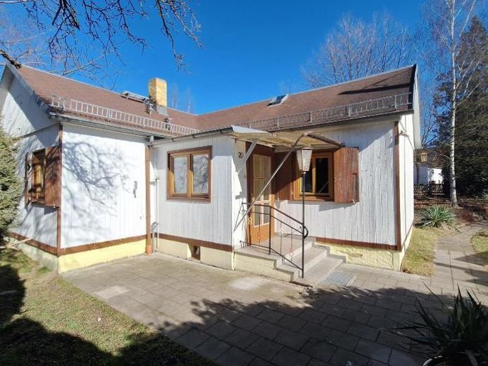 Das kleine Häuschen in Form eines Winkelbungalow wurde ca. 1960 bei dem Ausbau der Wehrstraße an der jetzigen Stelle wiederbaut. Es hat drei Zimmer, eine Küche, ein Duschbad und einen kleinen Flur. Das Objekt ist selbst nicht bzw. kaum unterkellert. Im Flur gibt einen Kriechkeller mit dem Wasseranschluss. Die Beheizung erfolgt über den Kachelofen im Wohnzimmer und den Küchenofen. Das gesamte Objekt hat Holzfenster mit Isolierverglasung. Das Bad verfügt über eine moderne bodentiefe Dusche (120x80cm). Seit dem Abwasseranschluss zur Wehrstraße ist die ehemalige Klärgrube stillgelegt, die sich noch im Garten befindet. Sie kann evtl. auch zu einer Zisterne umgenutzt werden. Zusätzlich ist auch ein Brunnen vorhanden. Das Dach ist mit Pappschindeln gedeckt und in guten Zustand. Die Wände sind massiv (nur 15 - 25cm dünn) und mit Holz verkleidet. Im Sockelbereich sind Feuchteschäden erkennbar, besonders in den unbeheizten Schlafzimmern. Vor dem Haus zur Süd-Ost Seite ist eine Terrasse vorhanden. Im Garten gibt es neben zwei kleinen Gartenhäusern, ein Gewächshaus und einen reparaturbedürftigen Holzschuppen. Es gibt neben dem Obstbaumbestand (Kirsche, Apfel und weiteres) auch einen alten Baumbestand an Weiden und anderen Bäumen.