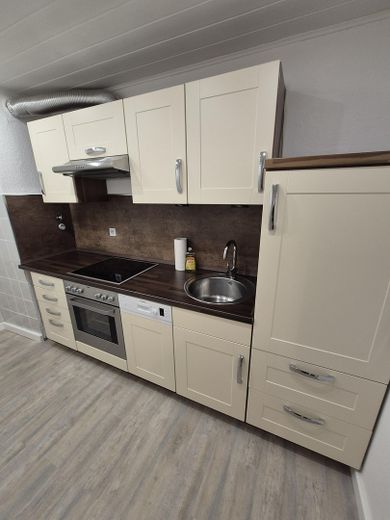 Eigener Treppenaufgang zur Wohnung, möbelierte Wohnung mit Schlafniesche, geräumiger Flurschrank, renoviertes Bad mit Glasdusche (fensterlos), Panoramafester (3-fach Verglasung), Küche nit Backofen, 4-Plattenkochfeld, Geschirrspüler, Kühlschrank mit Gefrierfach, Dunstabzug, Waschmaschienenanschluss, Trockenraum,