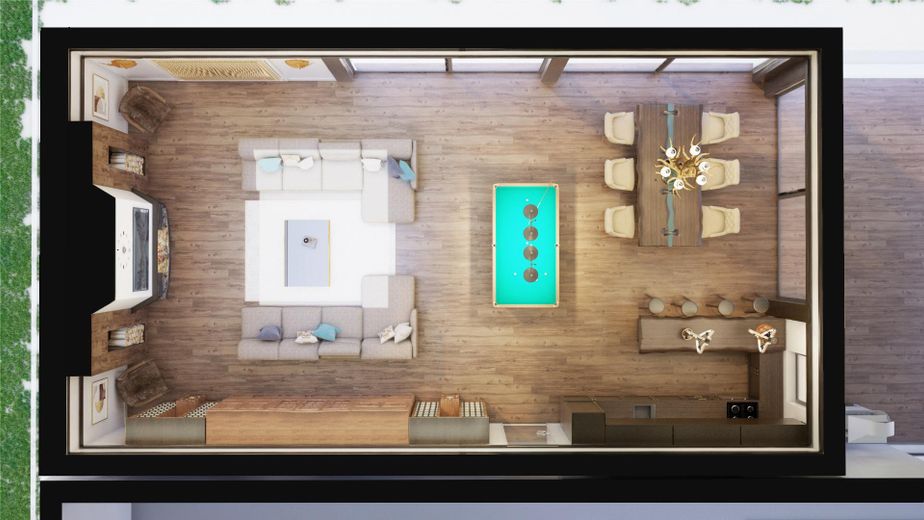 Das gesamte Erdgeschoss, welches sich durch einen großzügigen Wohn- und Essbereich, einen Wintergarten sowie eine weitläufige Sonnenterrasse auszeichnet, bildet den Lebensmittelpunkt des Hauses dar.