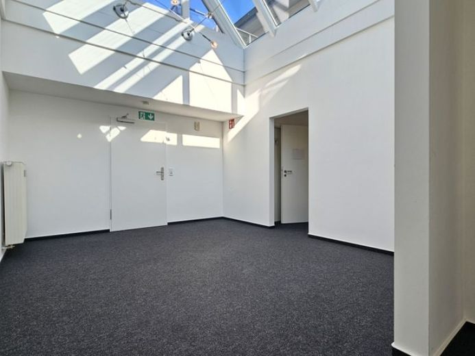 Der zentrale Empfangsraum, der durch das Atrium Tageslicht erhält, bildet das Herzstück der Immobilie. Dank der offenen Gestaltung und der hellen Lichtverhältnisse vermittelt dieser Raum eine freundliche und einladende Atmosphäre, die sowohl für Kunden als auch für Mitarbeiter eine positive Umgebung schafft. Von diesem Raum aus gelangen Sie in die umliegenden Räume, die eine vielfältige Nutzung ermöglichen.
