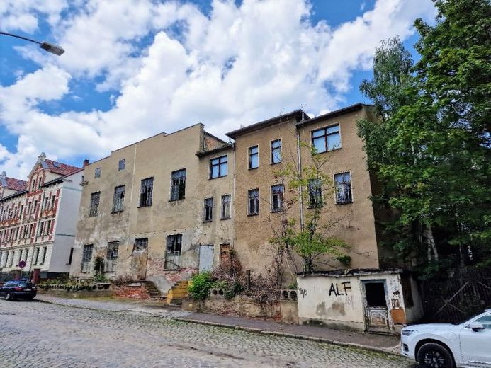 Das Grundstück ist noch mit Abriss-Gebäuden bebaut.