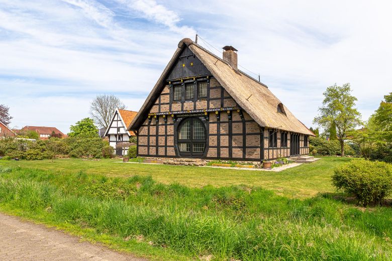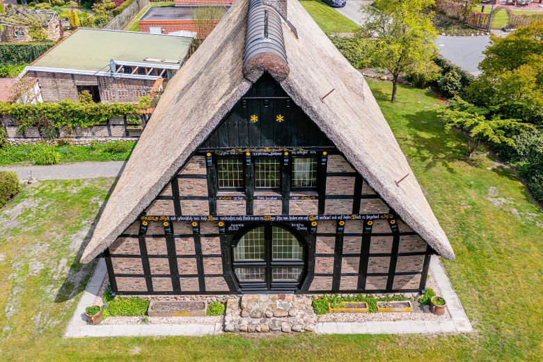 Das reetgedeckte Fachwerkhaus liegt auf einem liebevoll gestalteten, ca. 1.650 m² Grundstück, in direkter Lage am Stadtpark u. Fischteichen von Friesoythe. Über eine massive Holzbrücke gelangt man auf das Grundstück, wo sich Wohnhaus, Spiker, Carport u. Pergola befinden.