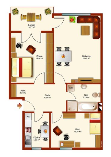 Vermietet wird eine schicke 3- Zimmer- Wohnung mit einem hervorragenden Grundriss. Zur Vermietung gehört u.a. ein Abstellraum im Keller.