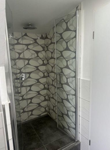 Modernes Bad mit zeitloser Optik, Dusche und WC.