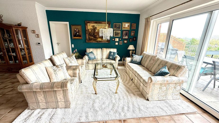 • Lichtdurchflutetes Wohnzimmer mit Kaminofen und Zugang zur Terrasse