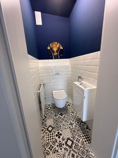 Bad mit Freistehender Badewanne und Dusche. Zweites Bad mit 1,40m Dusche. Parkett und 120 x 120 cm Fliesen. Zusätzlicher Freistehender Kaminofen.