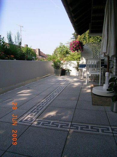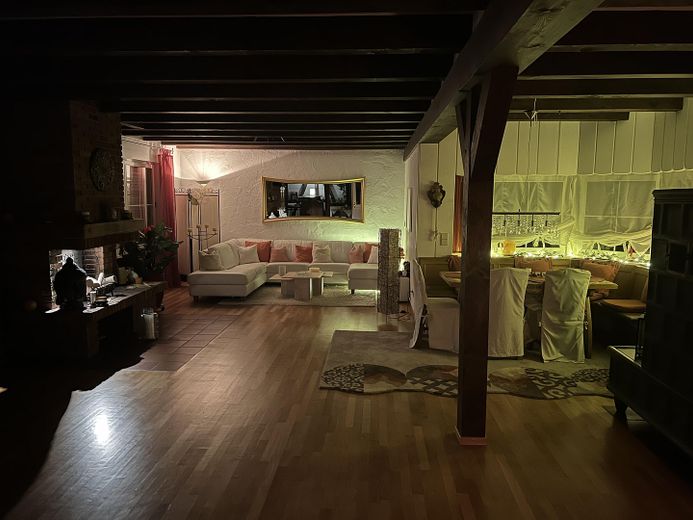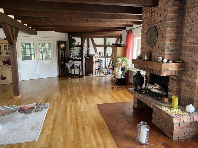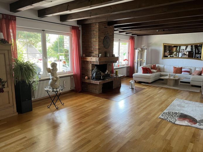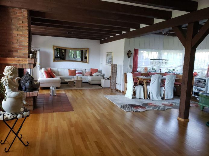 Im Erdgeschoss befindet sich als zentraler Mittelpunkt das Wohn- Esszimmer mit Echt-Parkett und einer Fläche von ca. 70 qm. Ein Kachelofen kann, neben der Zentralheizung und einem offenen Kamin im Winter für wohlige Wärme sorgen. Vom Wohnzimmer aus gelangen Sie auf die sehr große, sichtgeschützte Balkonterrasse, mit offenem Außen-Kamin und Blick in den Garten.