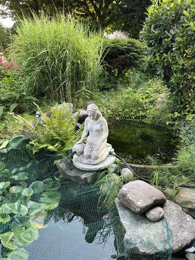 Der Garten beeindruckt durch seine üppige Vegetation und liebevolle Gestaltung, welche besonders in der wärmeren Jahreszeit seinen ganz besonderen Charme versprüht. Dann kann man auch das beruhigende Plätschern des Teiches, in dem sich diverse Fische wohl fühlen, das Vogelgezwitscher und die außergewöhnliche Ruhe mit allen Sinnen genießen.