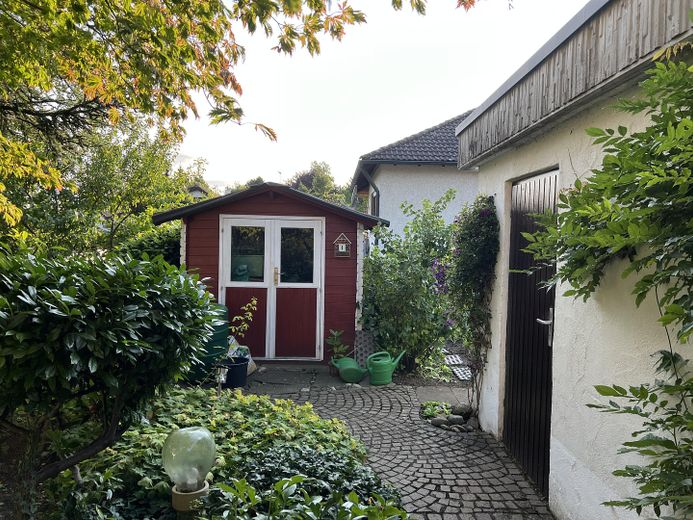 Außerhalb des Hauses erwartet Sie eine große Doppelgarage mit zusätzlicher Abstellmöglichkeit und ein kleines Gartenhäuschen.