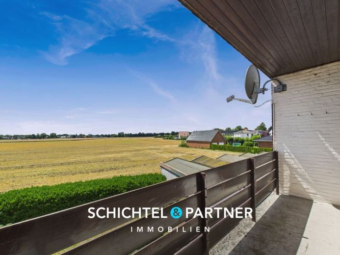 Der großzügige Wohnbereich im Erdgeschoss überzeugt mit viel Lichteinfall durch große Fensterfronten und dem direkten Zugang zur sonnigen Terrasse. Hier genießen Sie erholsame Stunden im gepflegten Garten – geschützt durch eine elektrisch ausfahrbare Markise. Der Blick reicht dabei über nahgelegene, unverbaute Felder – eine Seltenheit, die echtes Naturgefühl vermittelt.