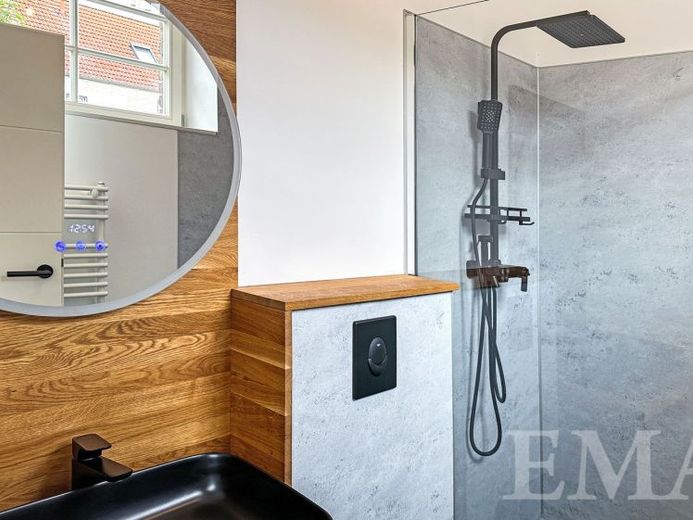 Die Remise teilt sich in Erdgeschoss, Dachgeschoss sowie Vollkeller auf. Der ehemalige Pferdestall wurde geschmackvoll zu einer Wohneinheit mit insgesamt vier Zimmern, Küche, Badezimmer mit Badewanne und bodengleicher Dusche, Gäste-WC sowie Flur umgebaut. Zur Wohneinheit gehört eine ca. 30 m² große Süd-West-Terrasse. Die Wohnfläche beträgt ca. 110 m² und die Nutzfläche im Vollkeller ca. 50 m².