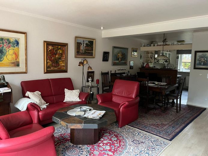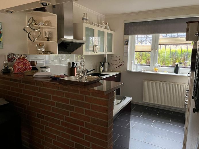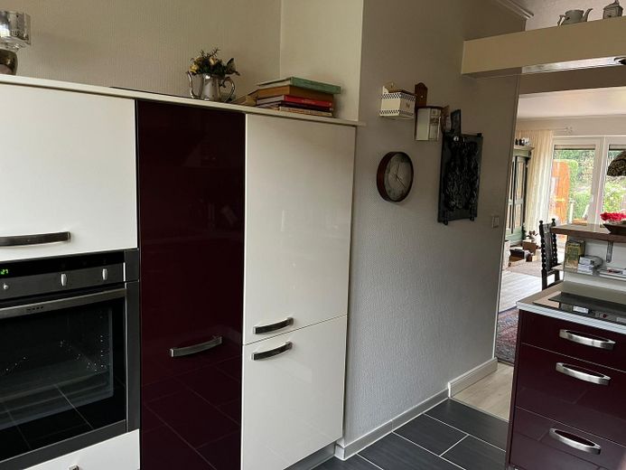 Im Erdgeschoss erwartet Sie ein offener Wohn- und Essbereich mit Zugang zur sonnigen Terrasse und dem Garten - Die offene Küche, die nur durch einen Tresen vom Wohn- und Essbereich abgetrennt ist stammt aus dem Jahr 2010. Ein Gäste-WC mit Fenster rundet das Raumangebot auf dieser Ebene ab.