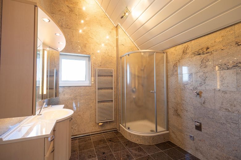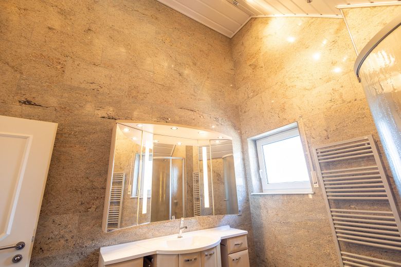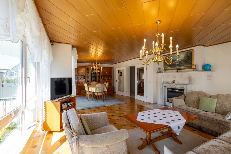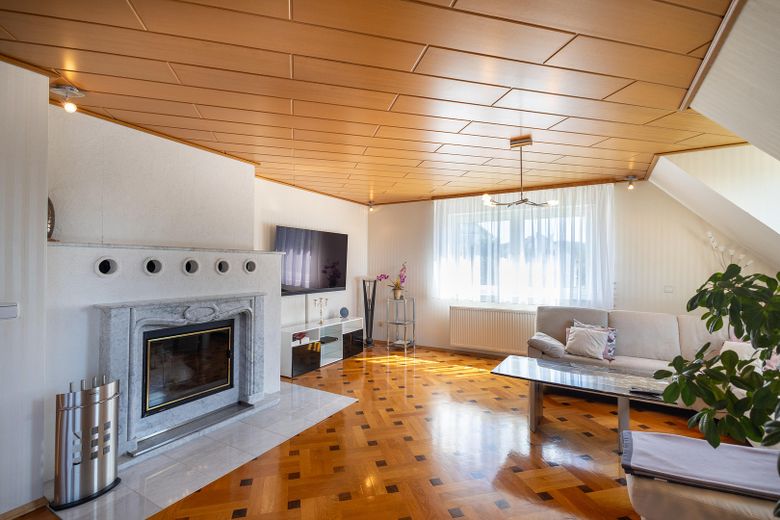 Das Obergeschoss bietet Ihnen rund 126 qm Wohnfläche, mit hochwertiger Küche, geräumigem Wohnbereich mit Kamin und mehreren Schlafzimmern. Große Fensterfronten lassen viel Tageslicht herein und rahmen die beeindruckende Aussicht perfekt ein.