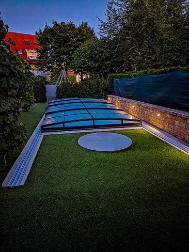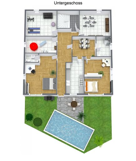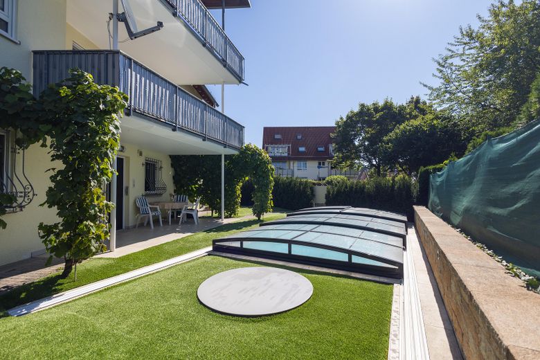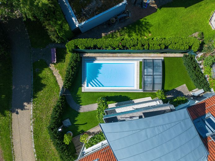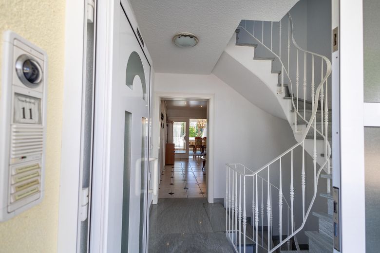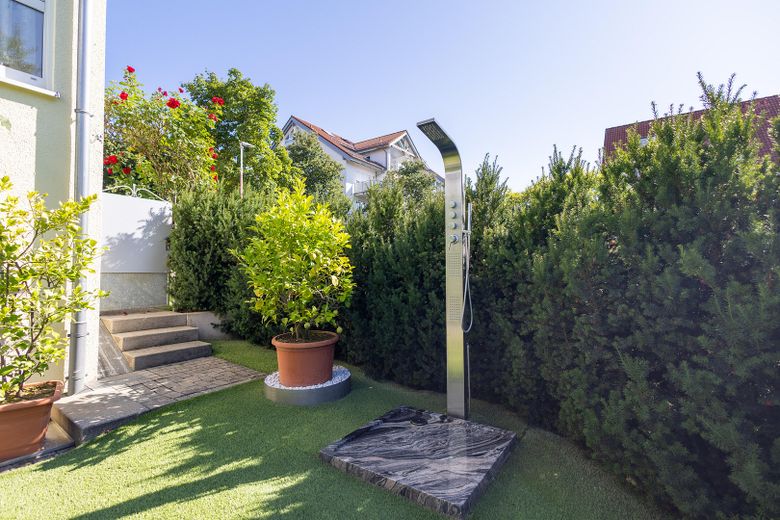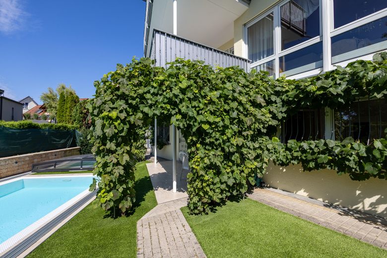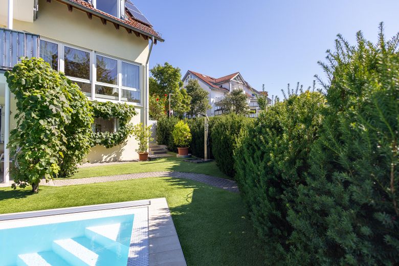 Das Haus betreten Sie über einen repräsentativen Eingangsbereich, von dem aus Sie die einzelnen Wohneinheiten erreichen. Dazu bietet der separate Südeingang einen direkten Zugang zu den Räumlichkeiten im Untergeschoss und zum Garten- und Poolbereich. Hier genießen Sie entspannte Stunden mit Familie und Freunden. Eine Freiluftdusche am Pool sorgt für Erfrischung an warmen Sommertagen.