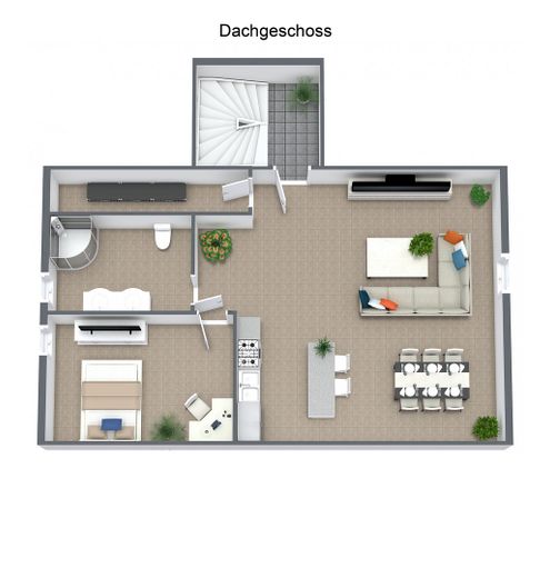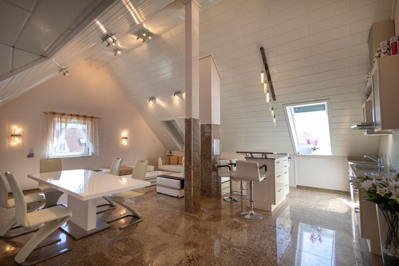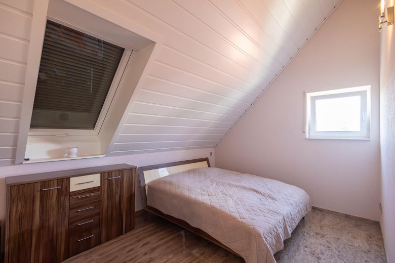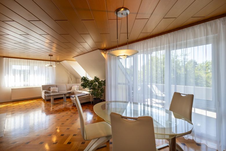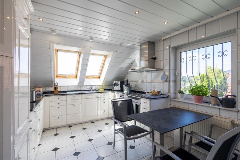 Im Dachgeschoss erwarten Sie weitere ca. 71 qm Wohnfläche – ideal als separate Wohnung für erwachsene Kinder, Gäste oder zur Vermietung. Auch hier finden Sie eine voll ausgestattete Küche und charmante Wohnräume unter dem Dach.