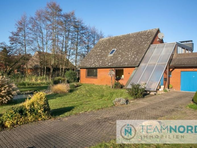 Der Außenbereich des Hauses vermittelt sofort ein Gefühl von Ruhe. Der Garten wird von einem Teich akzentuiert, der als natürlicher Blickfang eine besondere Atmosphäre schafft – ideal für sommerliche Abende oder entspanntes Familienleben im Grünen. Eine angrenzende Garage rundet das Angebot ab und sorgt für zusätzlichen Komfort im Alltag.