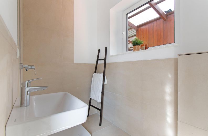 Zurück im Eingangsbereich erreichen Sie ein weiteres Badezimmer. Über die schöne Holztreppe kommen Sie zu den beiden weiteren Schlafräumen im Obergeschoss.