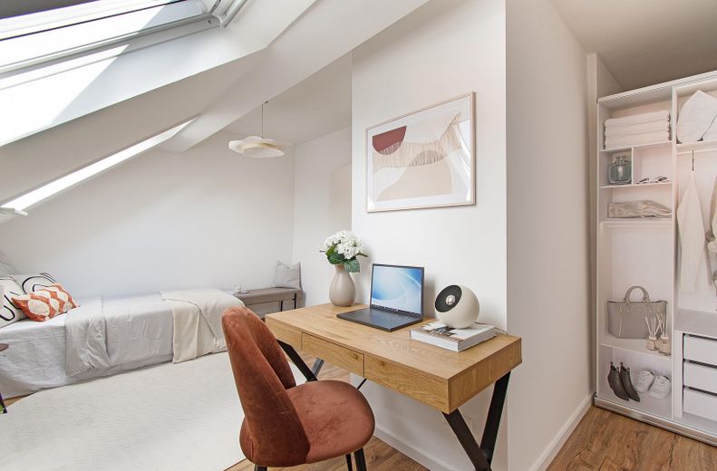 An die Wohnräume im Erdgeschoss schließt sich ein Schlafzimmer mit begehbarem Kleiderschrank und En-Suite Vollbad an. Mit wenig Aufwand ließe sich die Küche im EG in ein weiteres (Schlaf)Zimmer umwandeln.