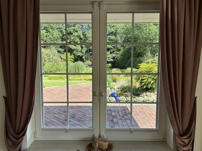 Von hier aus gelangen Sie in das Wohnzimmer mit Kamin, das mit seinem Ahornparkett und dem Blick ins Grüne ein besonderes Wohlfühlambiente schafft.